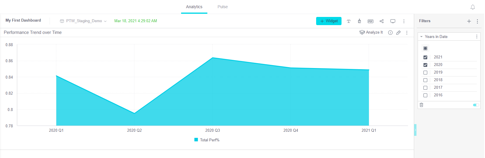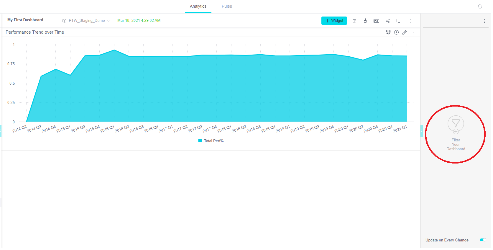 If you have multiple widgets on your dashboard, you can create a filter on the entire dashboard by drilling down into a specific filter.