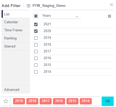 The filter will then ask you to select what dimension and data you would like to use. In this case, we will leave the data in Years, and only select 2020 and 2021. Click OK, and the filter will be applied to the data.